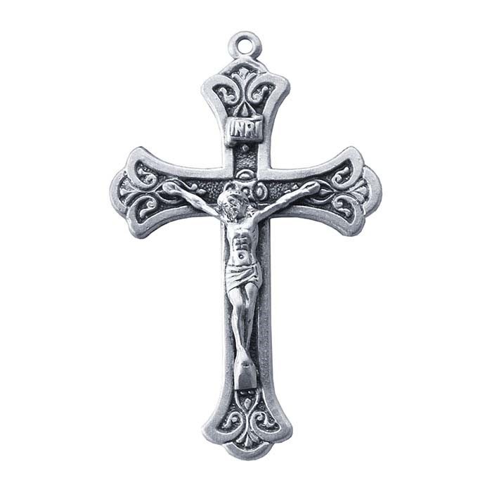 This sterling silver crucifix pendant features a flared cross with Art Nouveau styling and life-like details; the pendant is oxidized to highlight the design. Use it alone to create a necklace, or combine it with other charm and component styles to create a more complex necklace made with chain or cord. Attach your choice of bail to the pendant, and string it onto chain or cord for an eye-catching necklace.