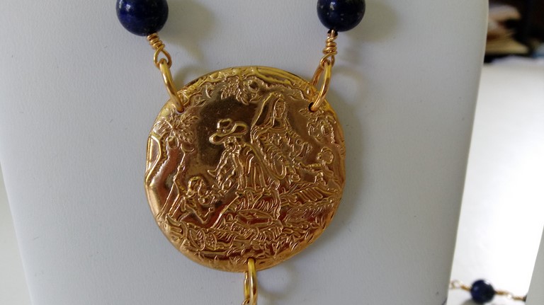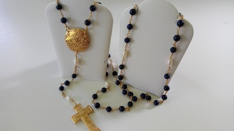 As the Bishop's favorite color is blue we decided to use genuine blue Lapis Beads for the rosary, which where attached to each other with handmade 24K Gold Vermeil Links. The Medallion and Cross were made in 24K Gold Vermeil ( 24K Gold over Sterling Silver ) and we even designed a custom cross for the rosary. All in All it ended up being a stunning georgious piece of Wearable Art.
