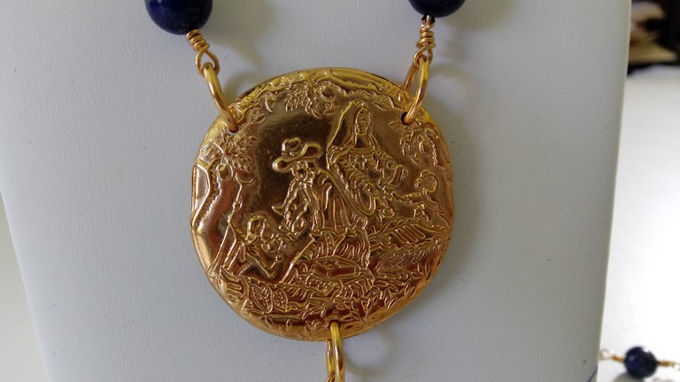 MEDALLION: The Center medallion, was inspired by the unique artwork of Dietrich Varez, one of the most beloved artists in Hawaii. He worked with the well known nun from Honolulu and the Catholic Church to create the wonderful artwork depicting Saint Damien and Saint Marianne which today can be found at most Catholic Church offices throughout the islands. We colaborated with Dietrich, and combined the images of two of his prints to feature Saint Damien and Saint Marianne next to each other on one special medallion on which they are both depicted helping leper patients on Molokai.